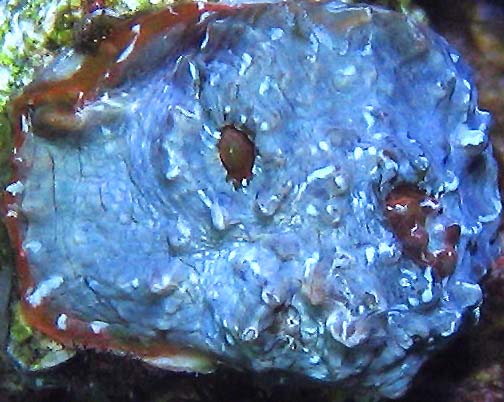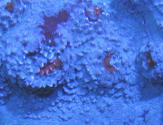 of lighter white blue pigments. The leading growth edge of the coral develops a red