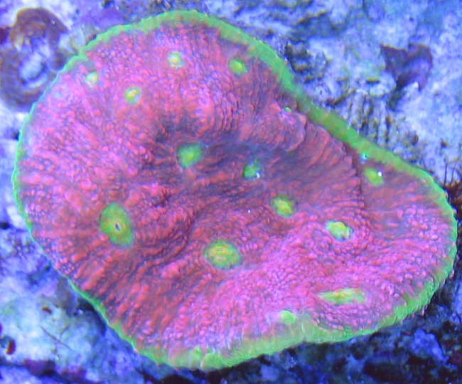 This Echinophyllia-like species is primarily bright pink and has some blue background coloration. Corallites are bright green and the edge of the colony has a bright green trim. The green trim can also contain other pigments. That combination of colors gives this coral an overall similarity to a slice of watermelon. This is probably why the initial discoverer of this coral gave the coral the name watermelon.