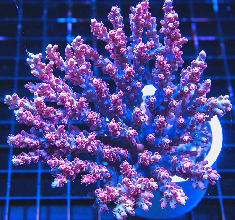 The WWC Pink Duster acropora was exported from Australia in mid year 2012. After the long trip from Down Under however, the coral did not seem to have very much color. Victor Fornari of WWC saw something very special in this coral and selected it out of dozens that had arrived from Australia that day. The crew back at the WWC shop however were not so impressed with Victor's selection. Victor had to persuade the crew that his incredible eye for coral color had spotted faint baby blue pigments in the base area along with faint pink pigments throughout the coral branches. After a few months the mostly brown coral had developed some amazing pigments. Now it had a strong baby blue base color with an overall pink coloration though out the polyps. During grow out these pink pigments were showing up on the coral and almost appeared as a pink dust.