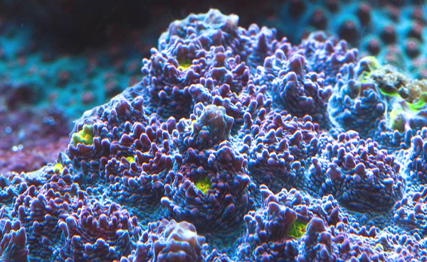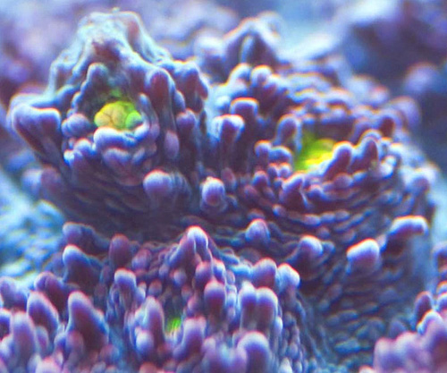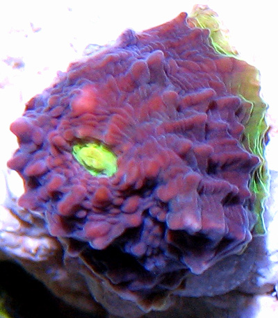 This coral is a Your Reef (YR) original and was found on a tranship from Indonesia in late 2009. The coral originally only had moderate pigment intensity, but its pigmentation intensified over 6 months in captivity. The Hybrid name that John created helps to describe the very unusual qualities and pigments of the surface structure of the coral. The coral was also named after John's daughter Riley. John recommends moderate light and moderate to strong water flow.