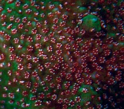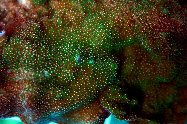 Another incredible coral from the private collection of Route 66 Marine. This coral has two primary pigment morphologies. A red background with red and white polyps and a green background with red and white polyps.
