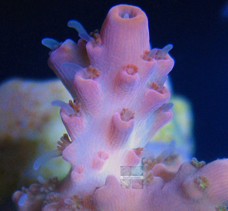 Each polyp extends an amazingly long and thick fuzzy tentacle as can be seen in the image above. Non extended polyp tentacles are colored red and the polyp centers vary from green to pink. Corallite walls are colored bright pink, while branch stems are colored cream white. That is the strong light and medium current healthy pigmentation pattern, which can be seen in the colony image below. Originally the colony also had green tipped corallite ridges. That green pigment can be seen in the lower base areas of our seed. The green pigment can also be seen in the main axial tip of the branch above where the pink looks a little more goldish. So the End of the Road name actually describes the long extended tentacles or roads coming out of the polyps.