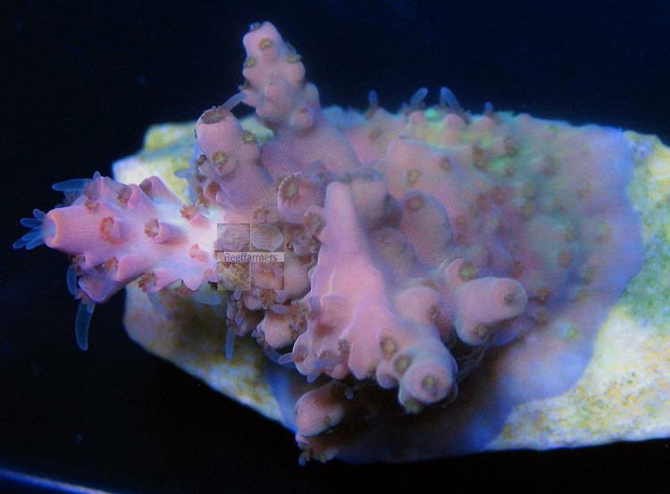 Reeffarmers is currently maintaining a seed section of this coral in a 8 foot Raceway Gyre BiZonal system. The original parent sections of this coral consisted of a base stub and two small fragments. They were not present when the Route 66 Marine facility was forced to cease its operations on July 3rd. We are assuming these were lost in the spring of 2015 when Route 66 Marine had heat and system problems. So the entire living sections of this coral consist of the Reeffarmers seed section and the first edition. That first edition frag was driven from California to west central Texas, then taken to Houston for Reef Currents, then taken to New Orleans for Fragniappe, and then taken to Atlanta/Birmingham for coral shows. All while traveling back to west central Texas each time. The frag lost its color during the process and was still coloring up when we released this coral.